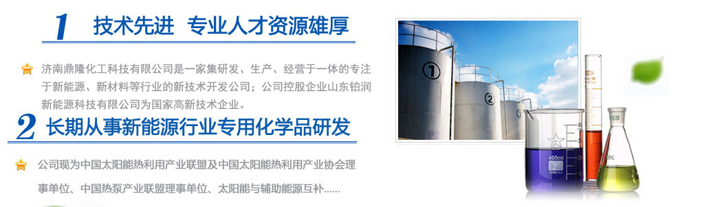 濟(jì)南鼎隆化工科技有限公司是一家集研發(fā)、生產(chǎn)、經(jīng)營于一體的專注于新能源、新材料等行業(yè)的新技術(shù)開發(fā)公司;公司控股企業(yè)山東鉑潤新能源科技有限公司為國家高新技術(shù)企業(yè)。擁有雄厚的科研實力和專業(yè)銷售隊伍以及多名從事化學(xué)化工專業(yè)的高素質(zhì)人員,其中博士生導(dǎo)師1人,碩士研究生3人。公司現(xiàn)為中國太陽能熱利用產(chǎn)業(yè)聯(lián)盟及中國太陽能熱利用產(chǎn)業(yè)協(xié)會理事單位、中國熱泵產(chǎn)業(yè)聯(lián)盟理事單位、山東清潔能源供暖產(chǎn)業(yè)聯(lián)盟理事單位、太陽能與輔助能源互補(bǔ)供熱/制冷工程專業(yè)委員會會員單位。公司專注于綠色科技,專業(yè)化研發(fā)環(huán)境友好型化工產(chǎn)品,與眾多高校和國內(nèi)外多家著名化學(xué)品公司保持戰(zhàn)略合作關(guān)系。公司擁有“載能”和“澤能”...更多